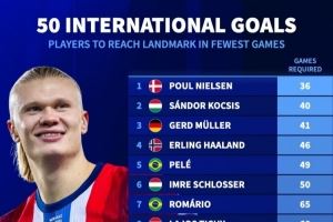 体育资讯10月13日讯 在上周对阵以色列的世预赛中,哈兰德上演帽子戏法,这让他成为历史上第4快打入国家队第50球的球员。作为对比,梅西用了107场才达到这一里程碑,而C罗则用了114场。德转列出了达成国家队50球所用场次最少的球员。